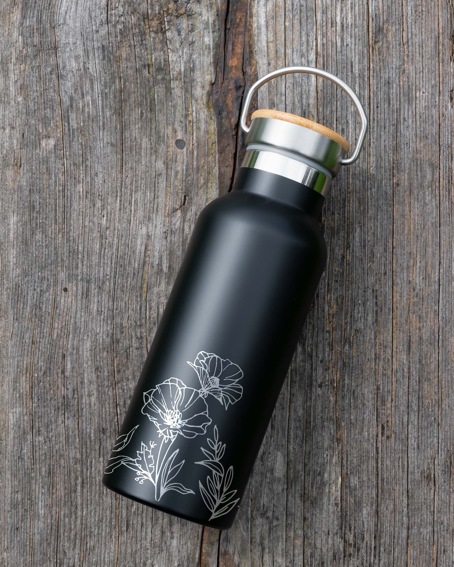 Black Stainless Steel Bamboo lid Bottle - Floral